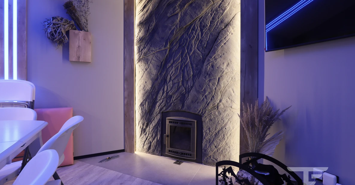 Наиболее красивым арт-объектом в комнате отдыха этого банного комплекса является портал банной печи. Это рукотворный процесс, который выглядит невероятно атмосферно.
