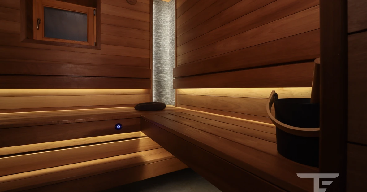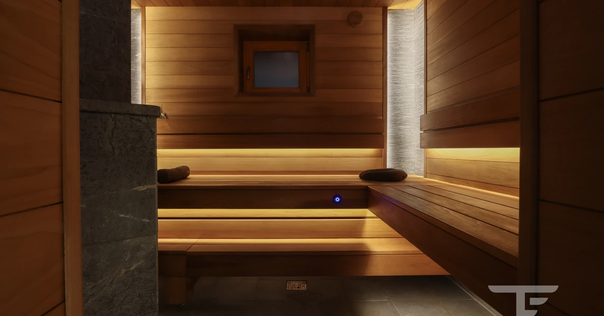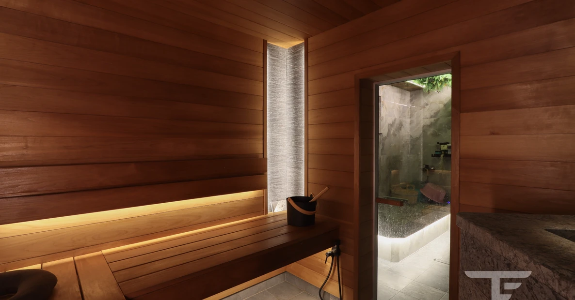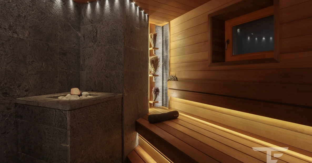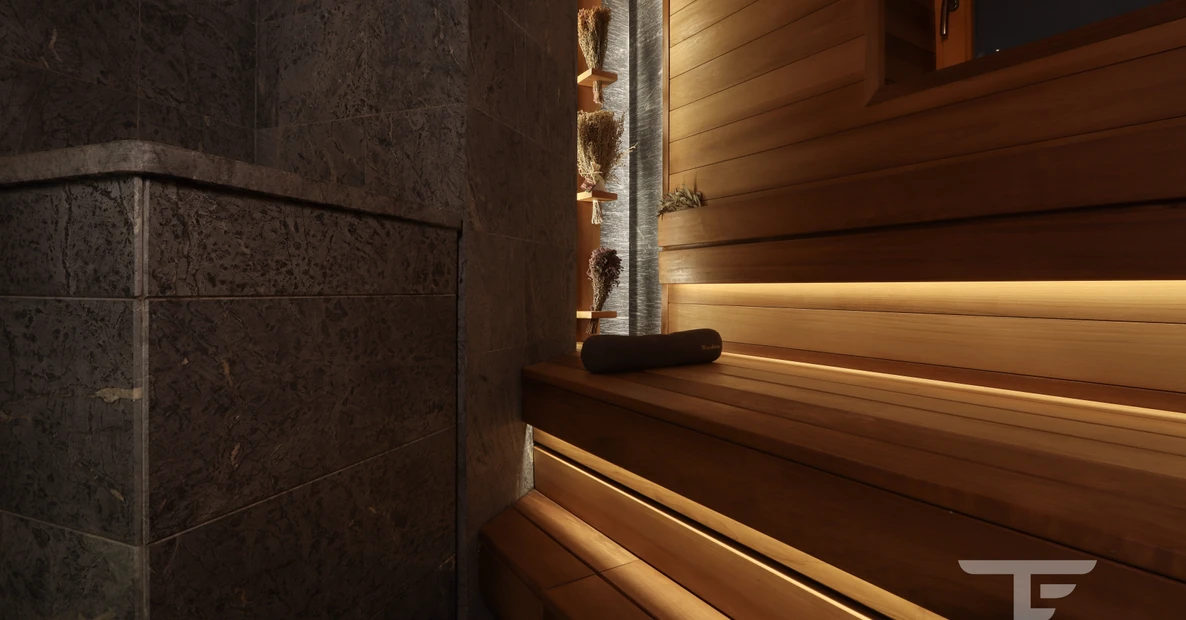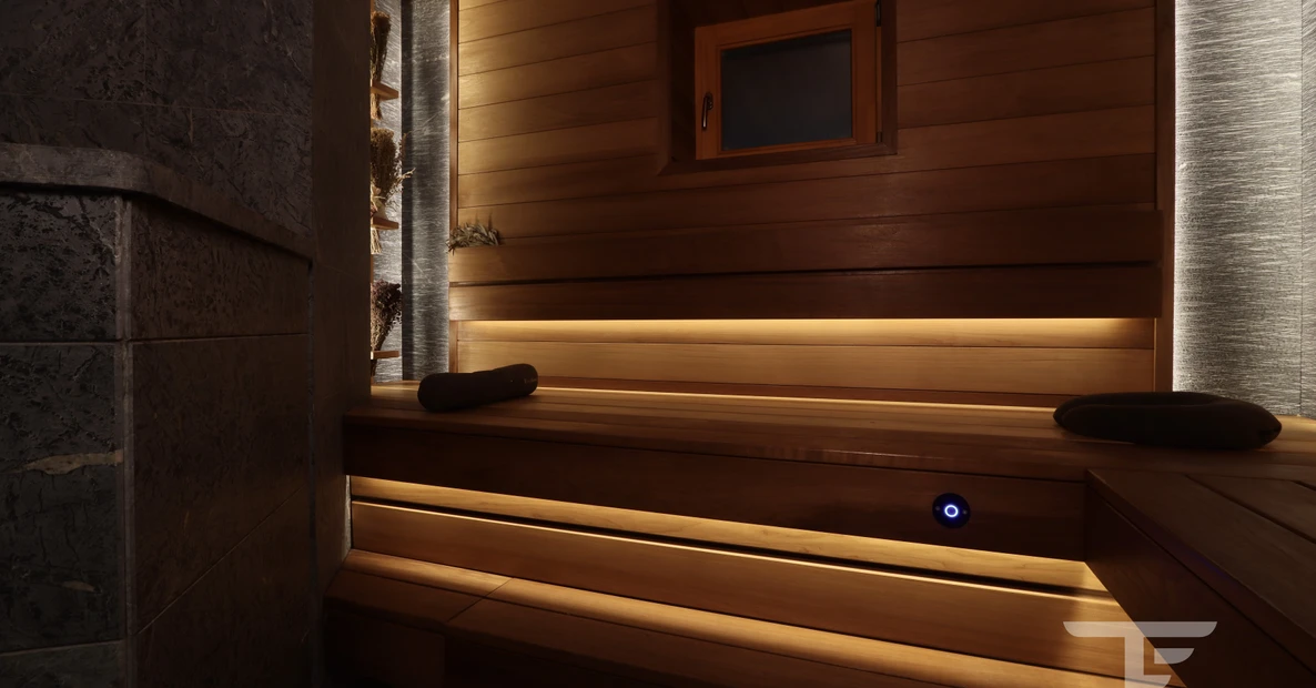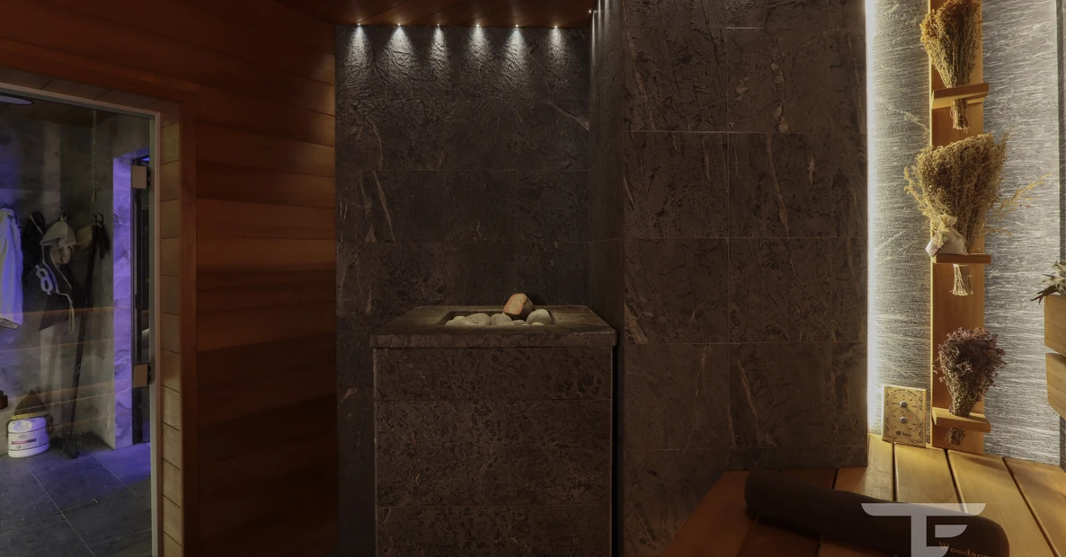 Особенно красиво выглядит плитка из талькомагнезита, которая использована в углах и в созданной нише. Особенно красива плитка за счет освещения светодиодными термостойкими лентами.