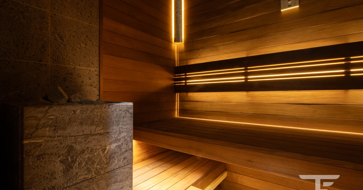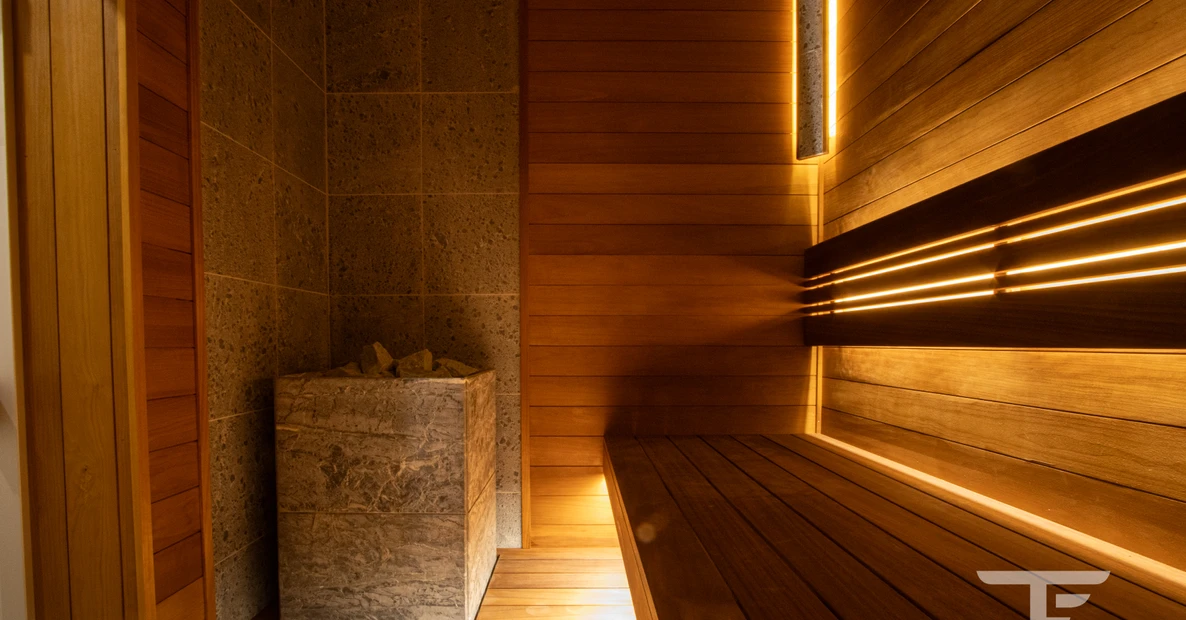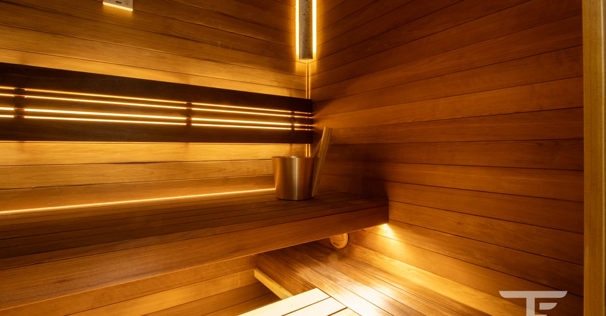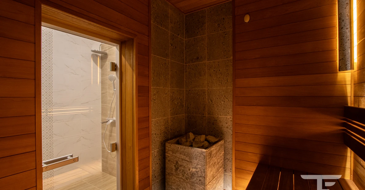 Отделка стен и полка из практичного материала - термоосина. Термообработанная древесина устойчива к влаге и обладает низкой маркостью.