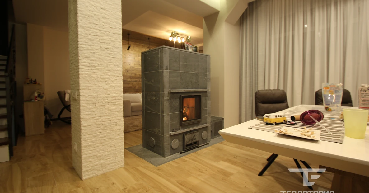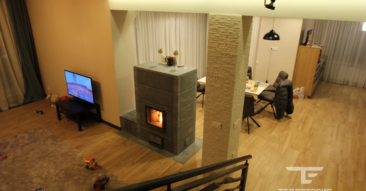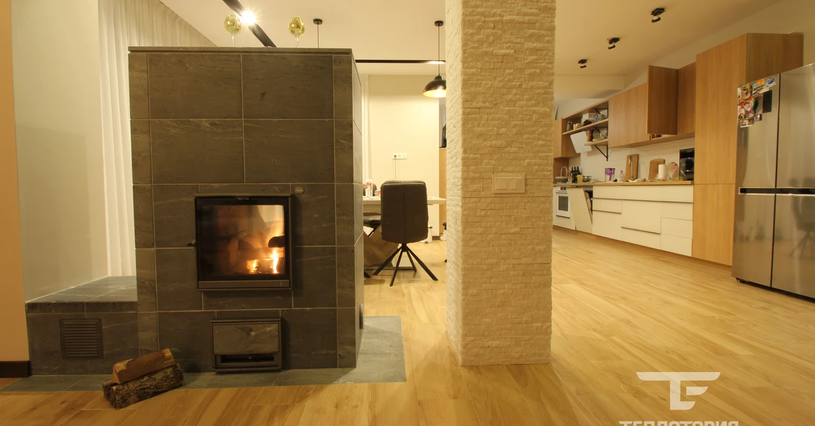 В этом проекте это сделано между гостиной и кухонной зонами. Сделано это с помощью камина Туликиви "TU2200/92".