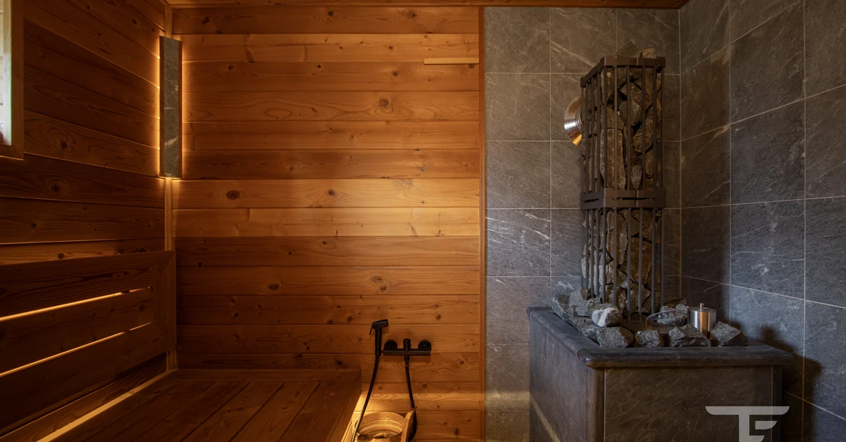 А банная печь в облицовке, чтобы микроклимат бани был комфортным и традиционным.
