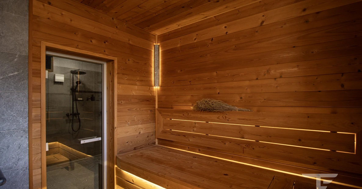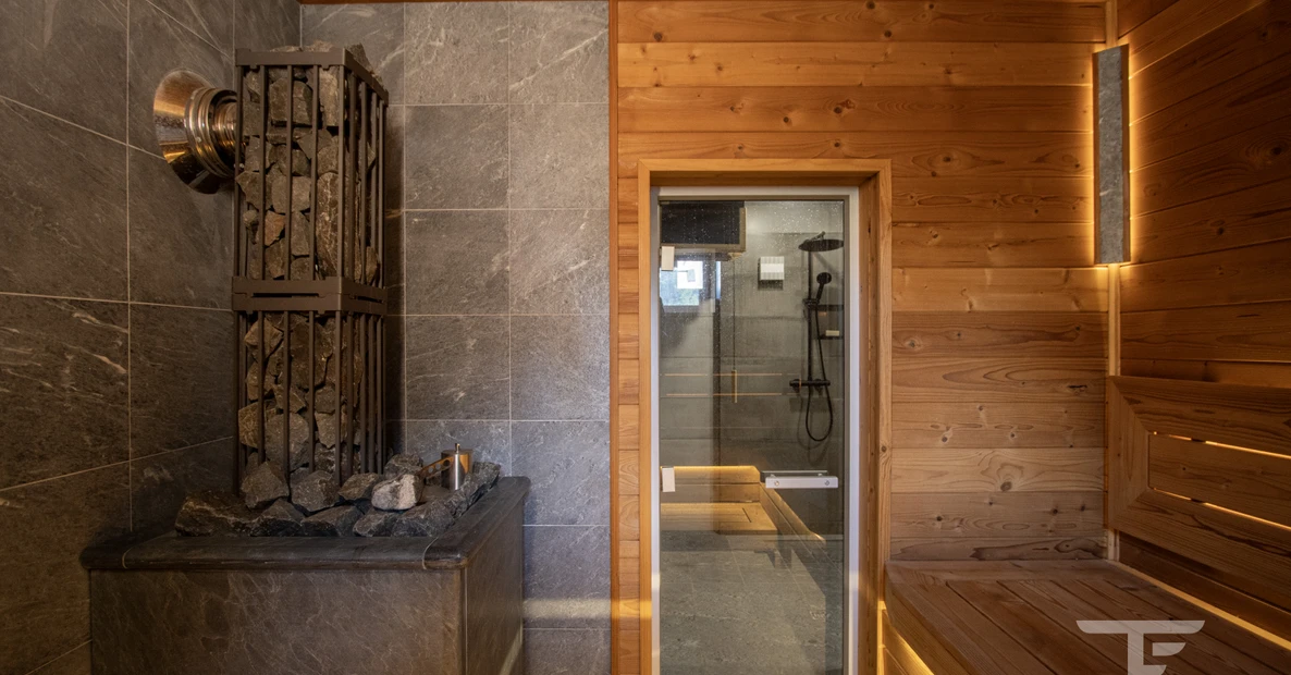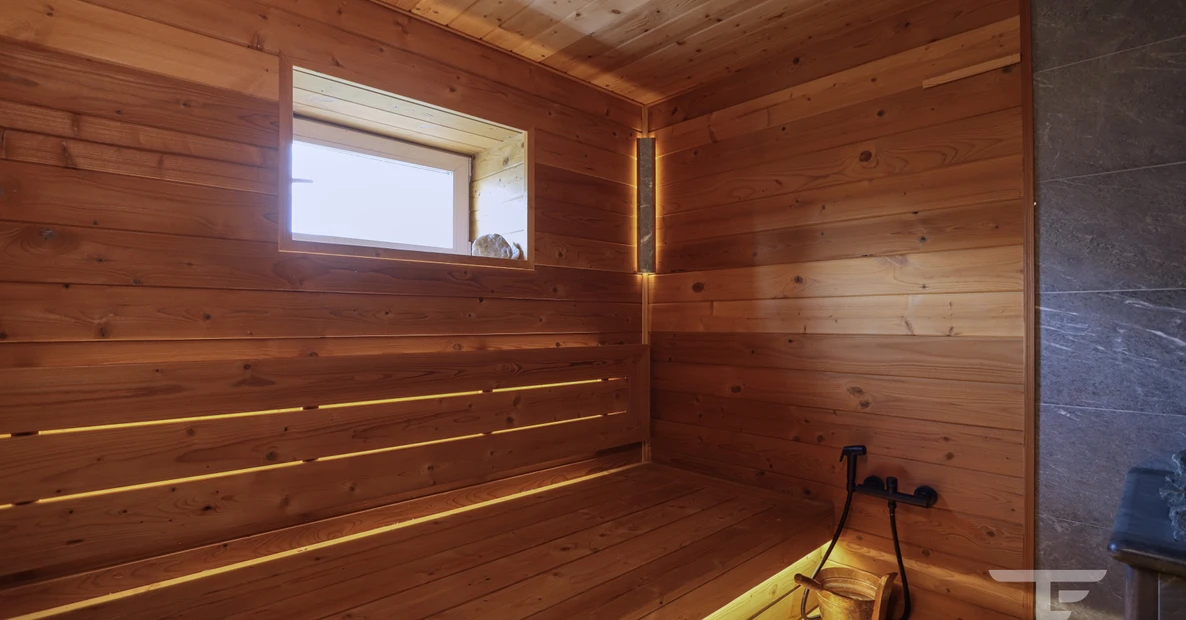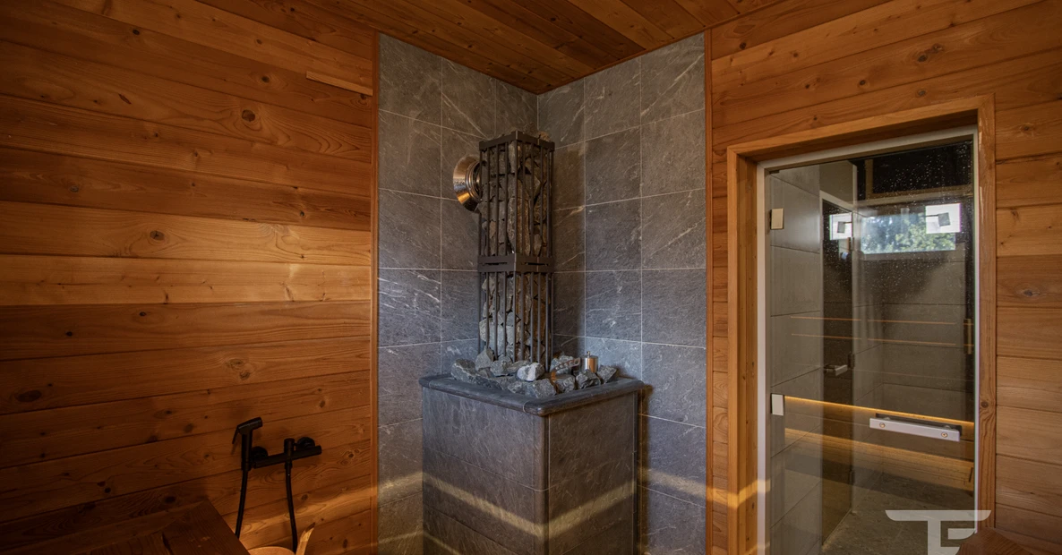 Необычный объект благодаря материалам для отделки стен и полка. Использована термообработанная сосна. Это материал со смолой. Выглядит аутентично, самобытно, колоритно. Именно в таких задачах решался этот проект.