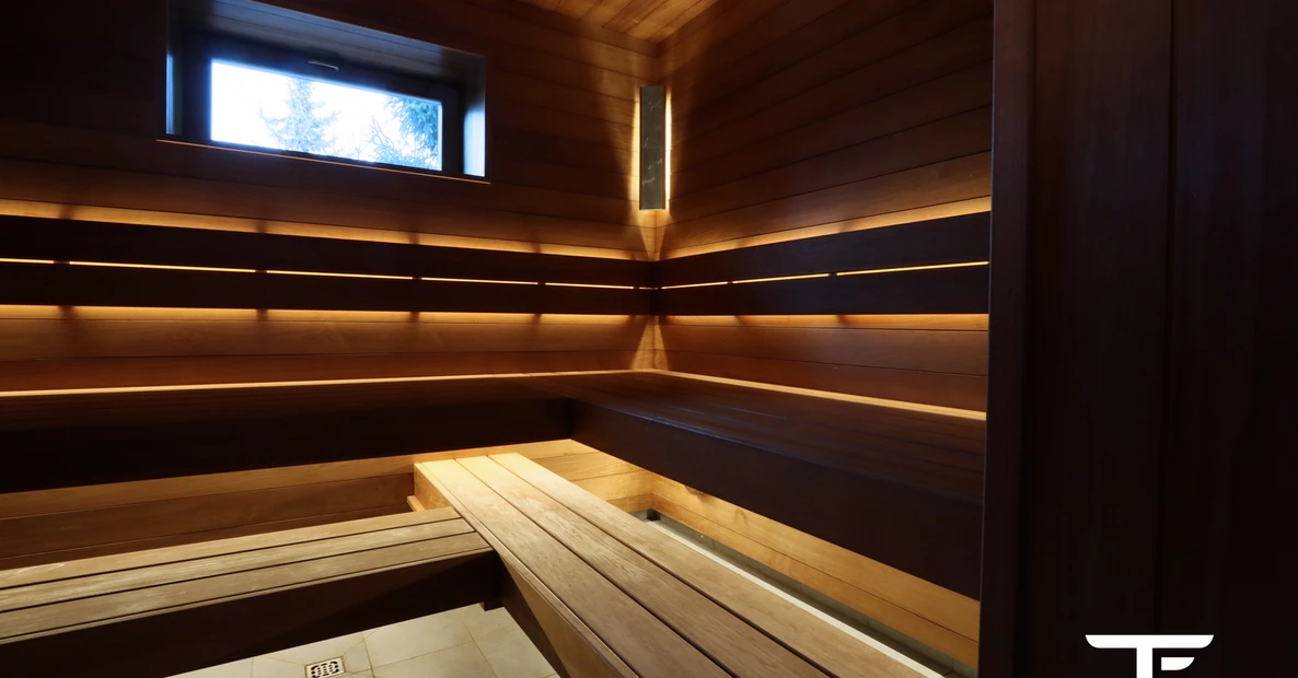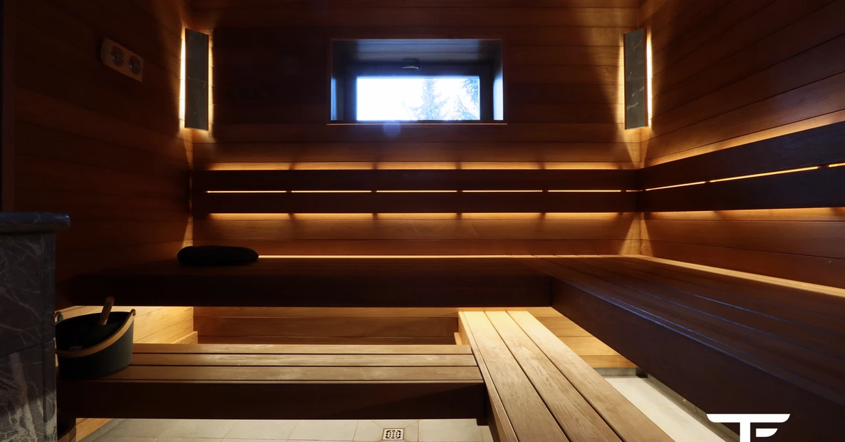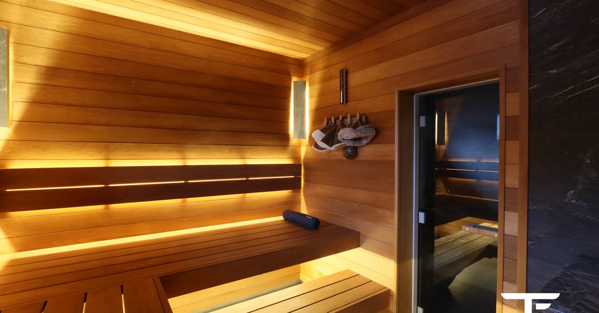 Лаконичная подсветка, строгие линий материалов делают эту баню минималистичной, строгой, стильной.