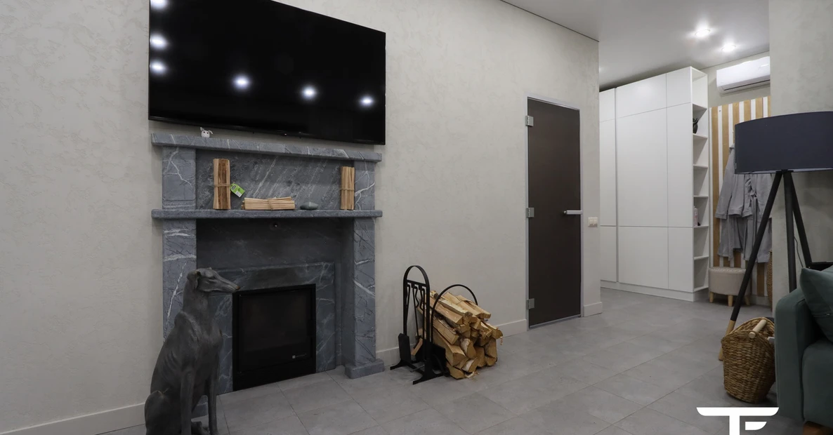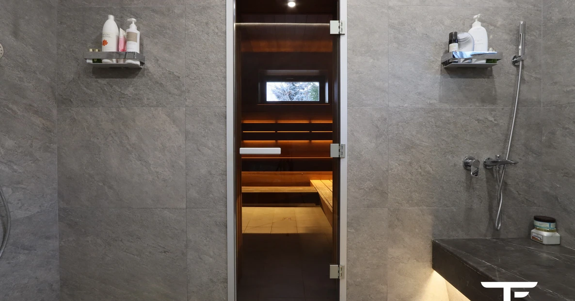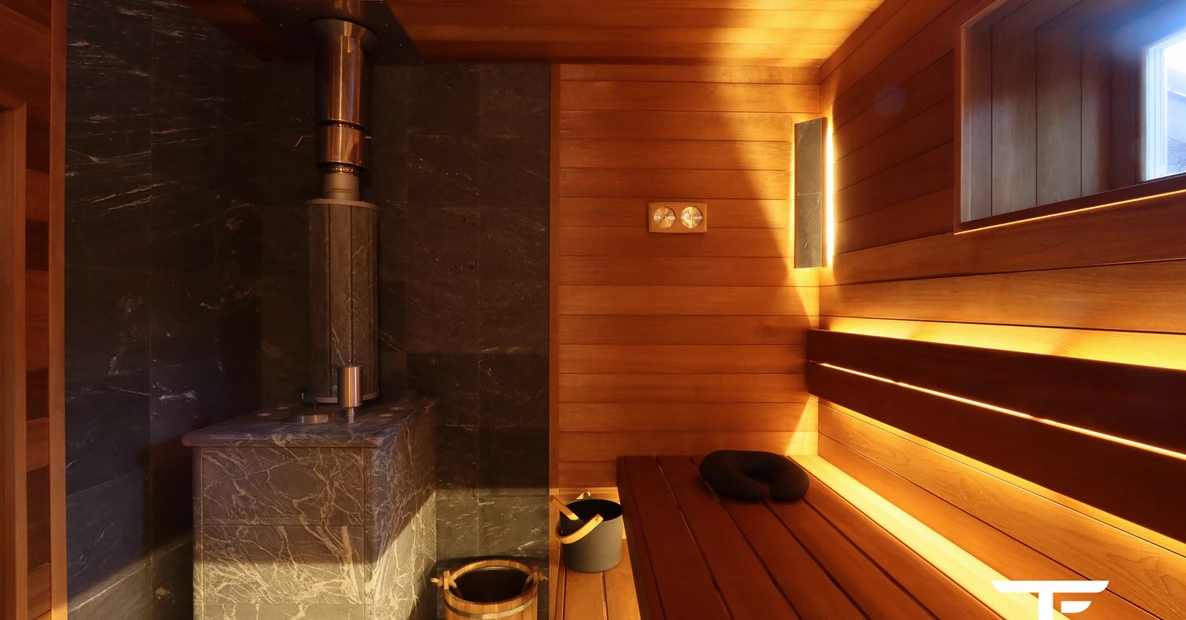 Лаконичная и стильная баня. Дровяная печь в облицовке.