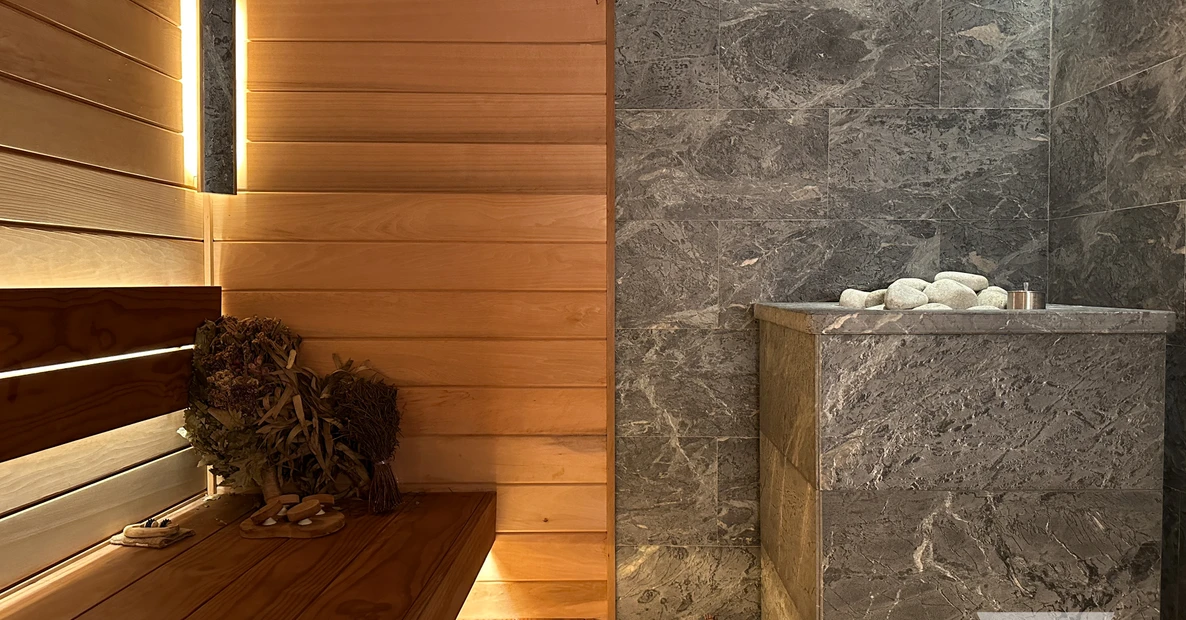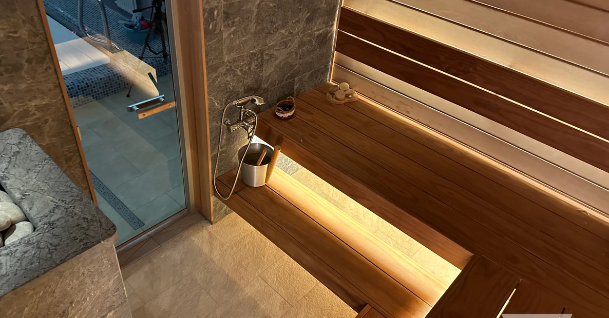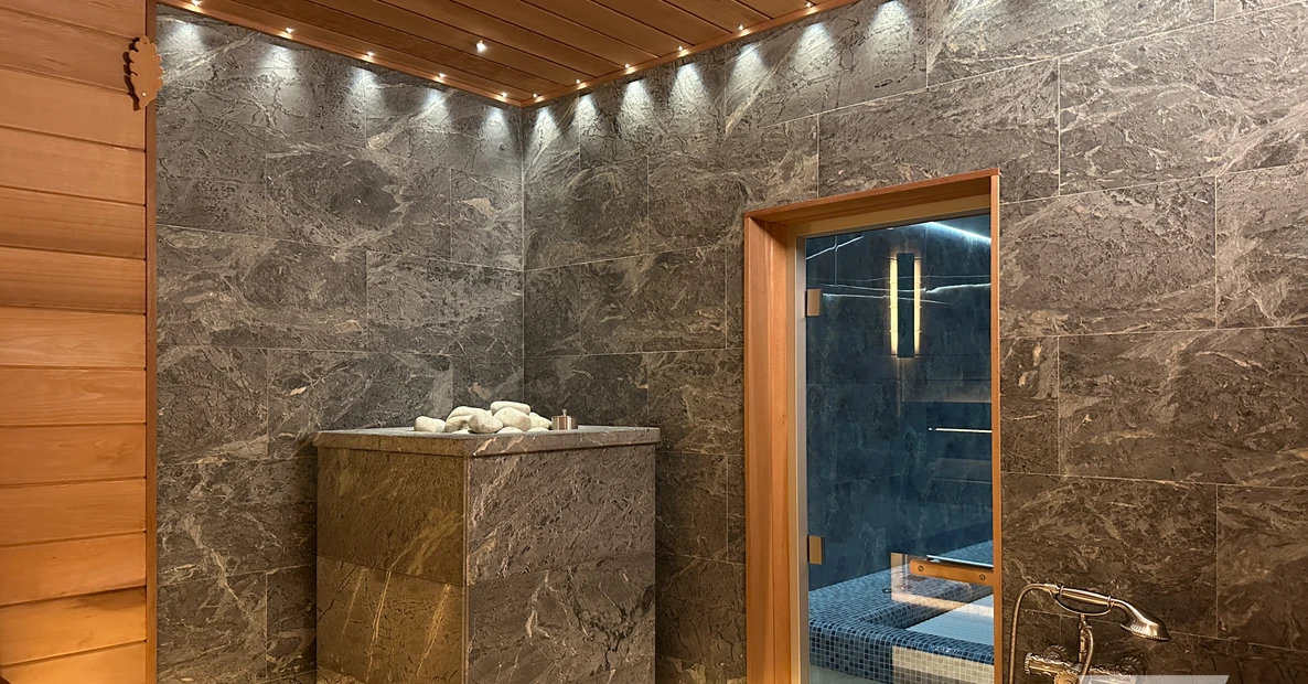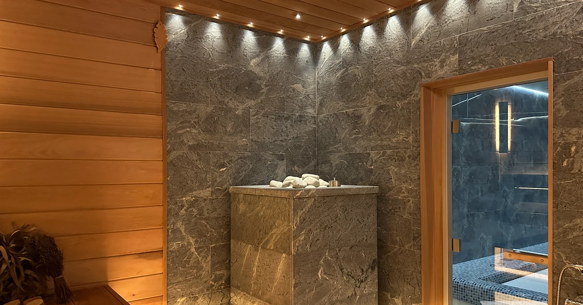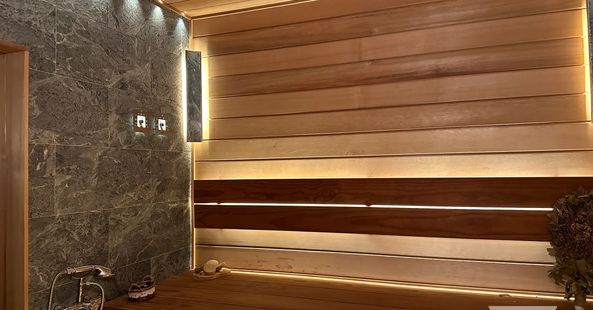 Это очень эффектный результат отделки парной за счет богатства текстуры материалов.