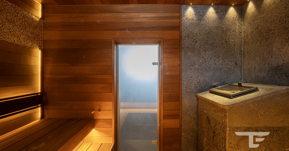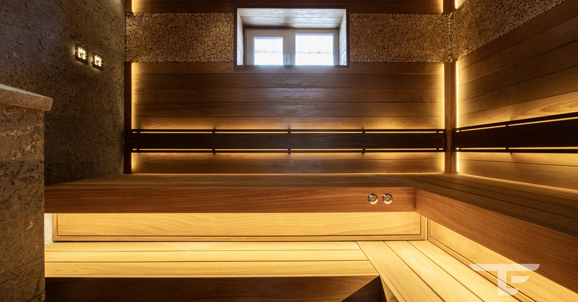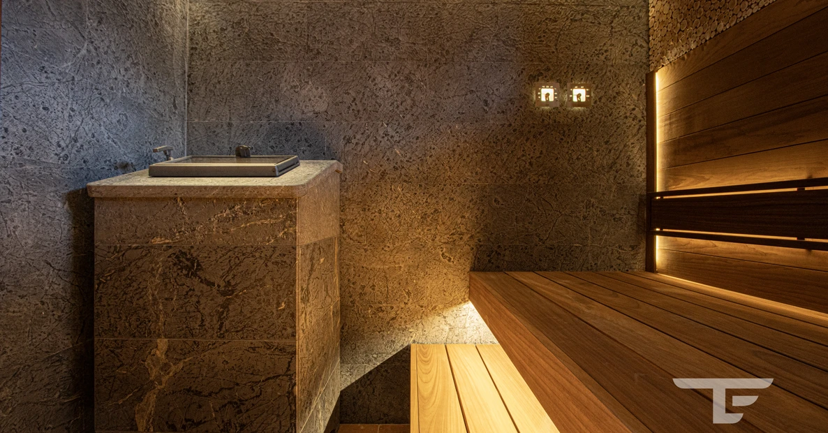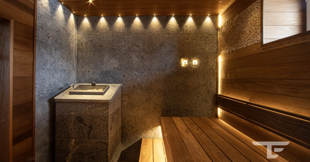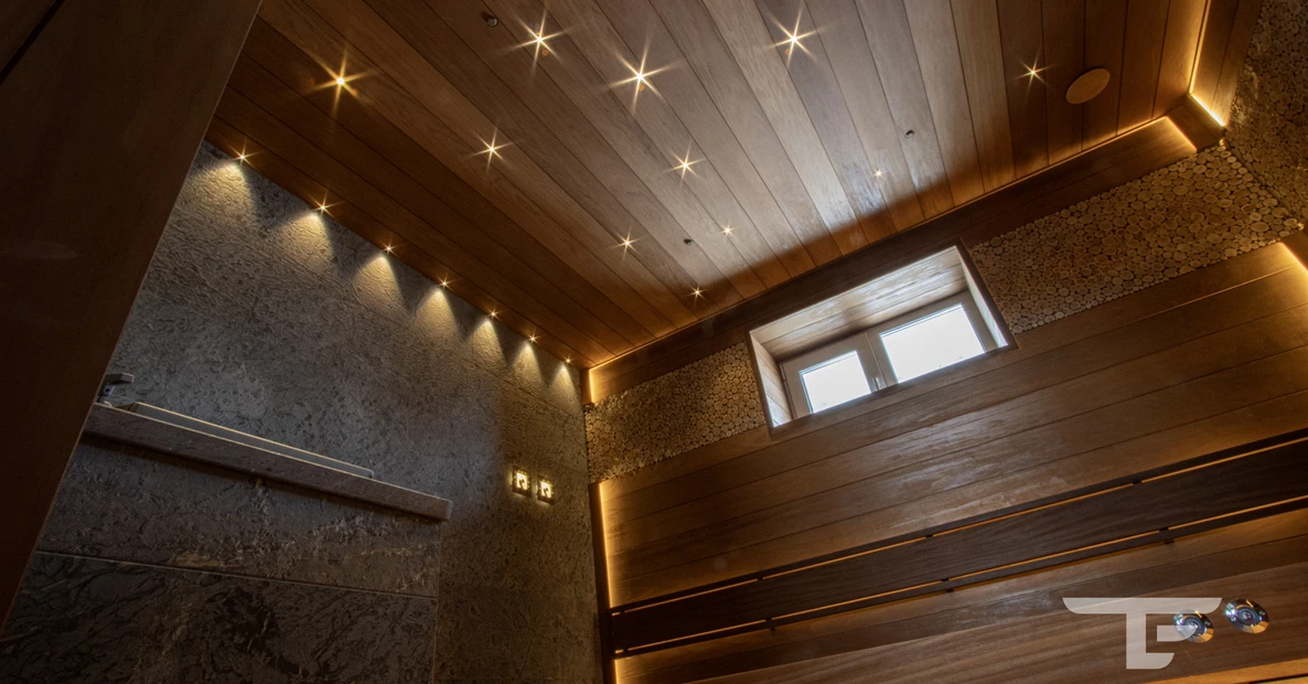 Отделка бани выполнена с помощью стеновых материалов из термоосины и можжевельника. А полок выполнен из широкой доски 130 мм, а материал тот же - термообработанная осина.
