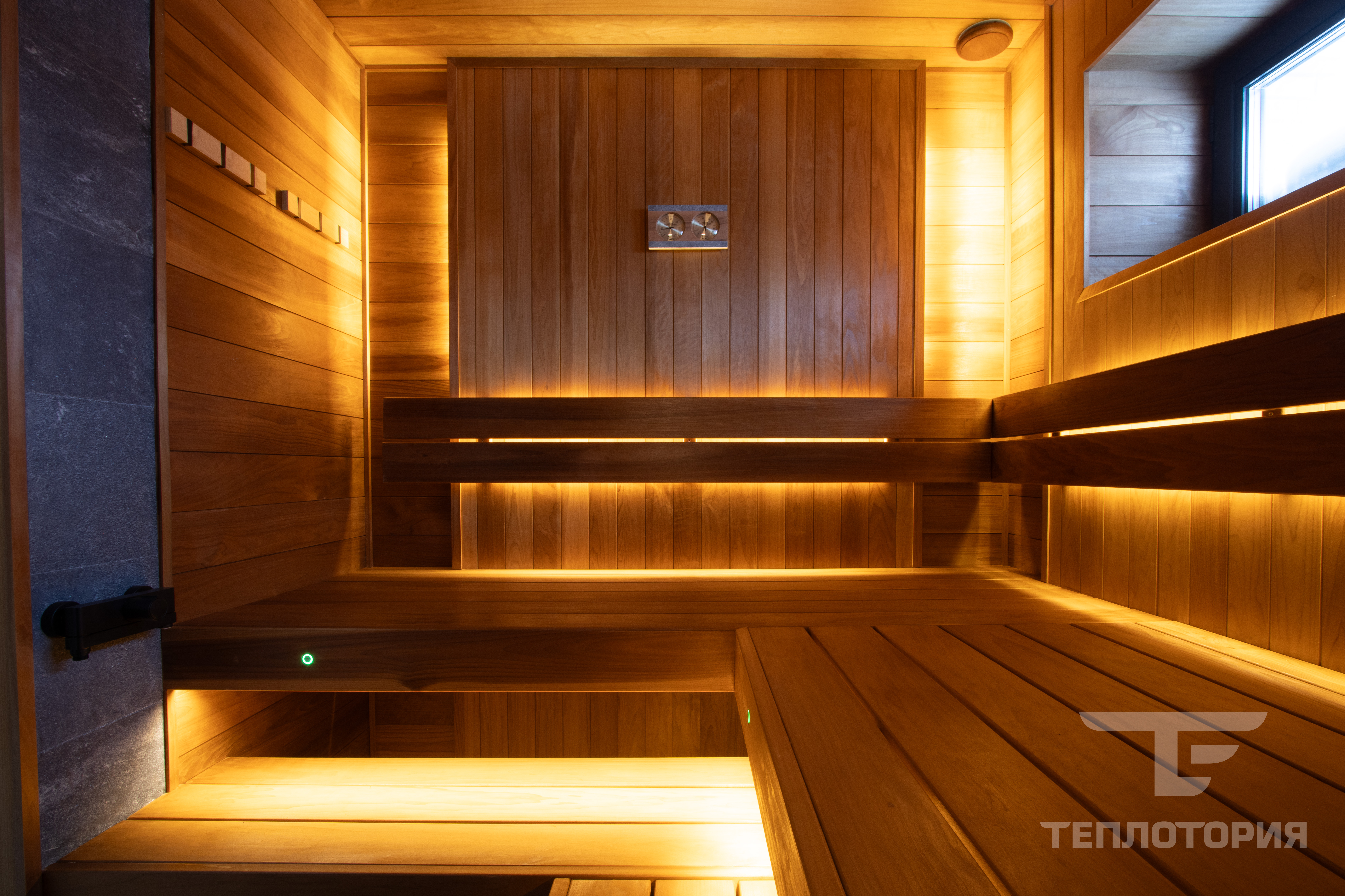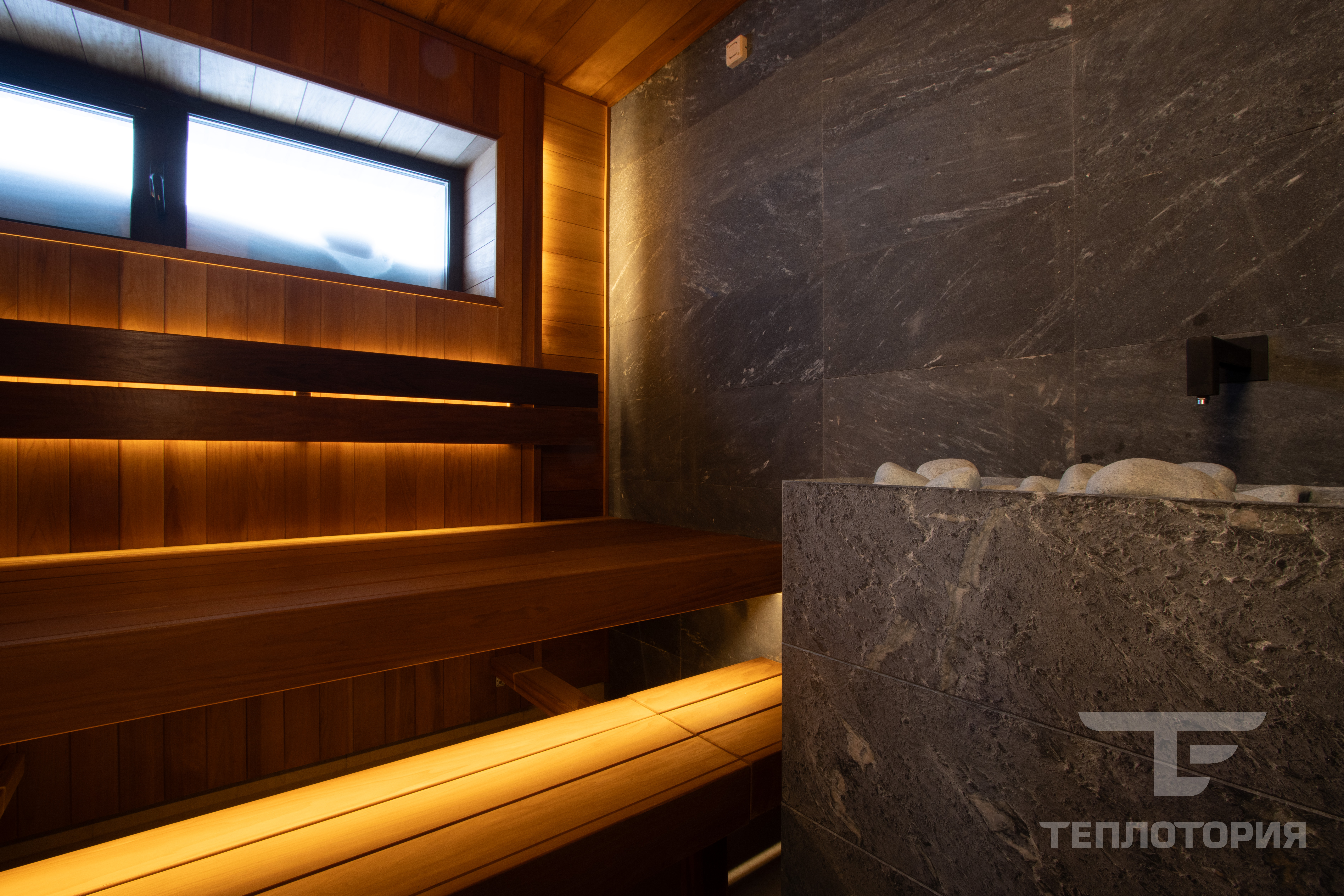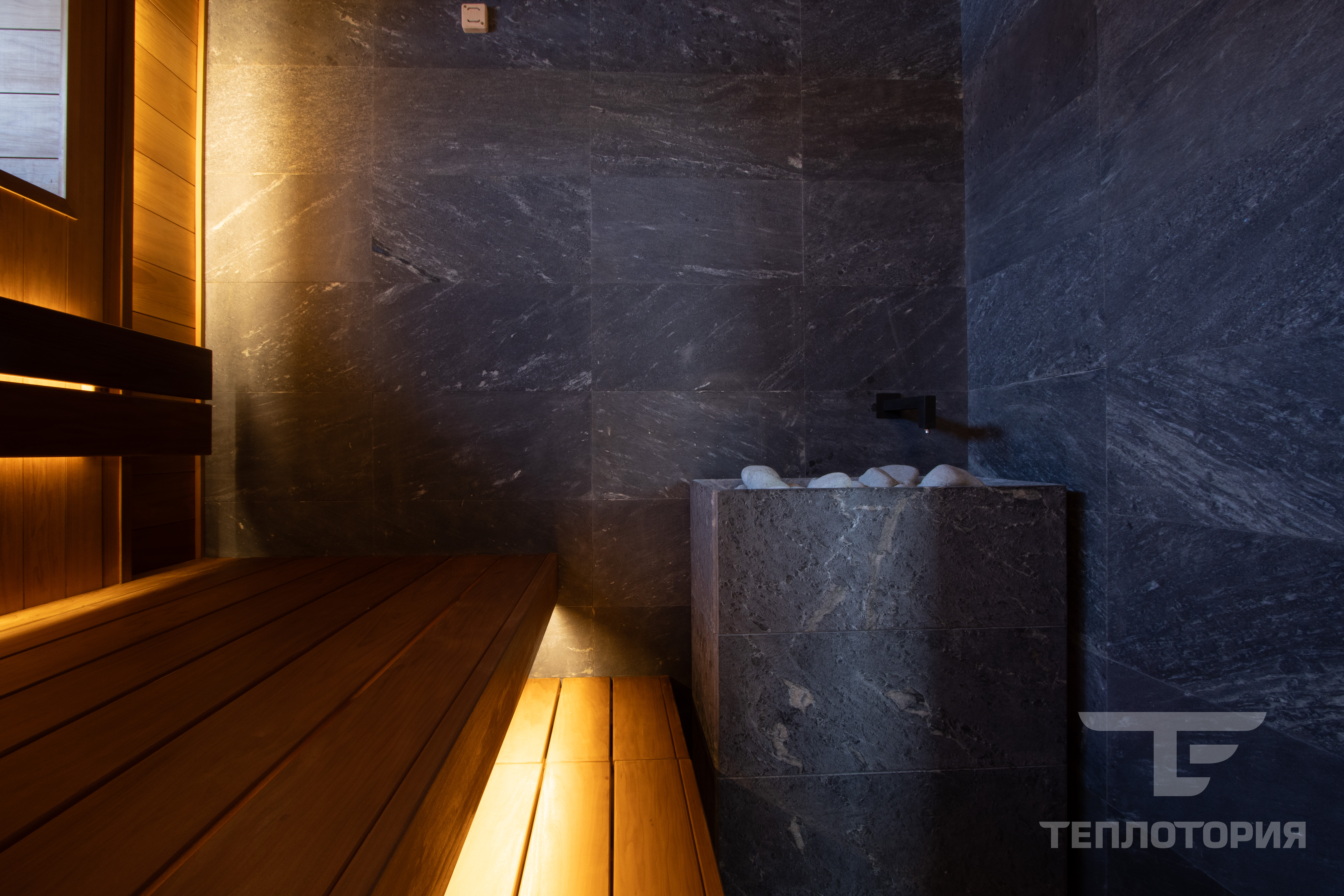 Отделка парной с помощью термодревесины и электрокаменка в облицовке.