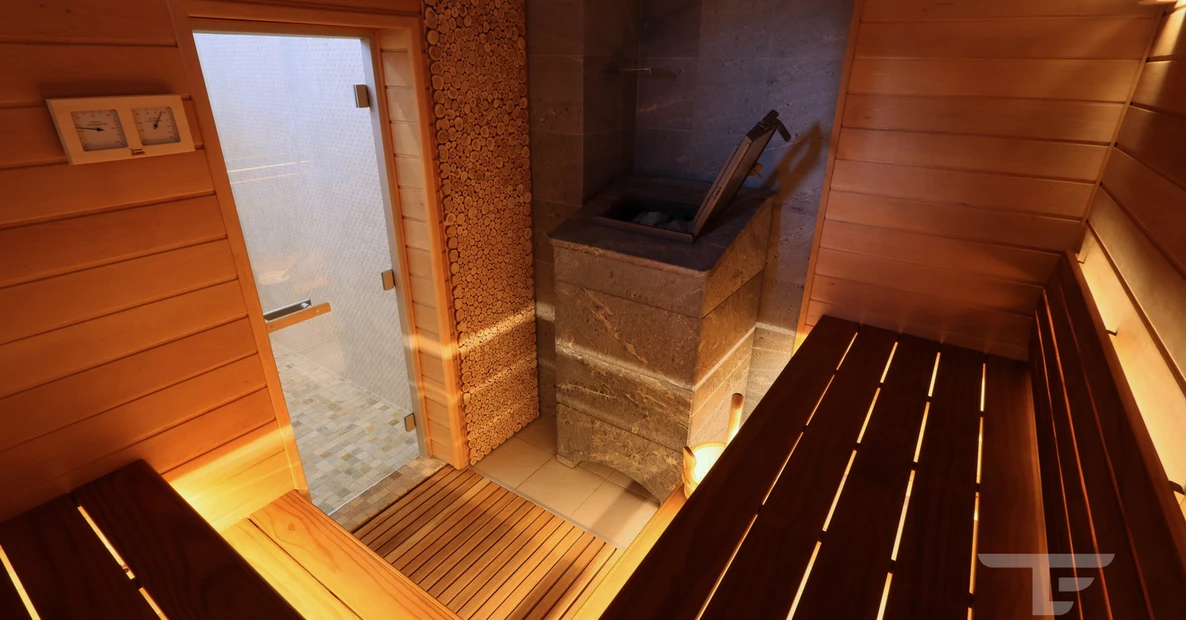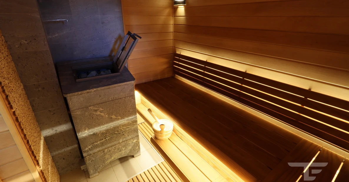 Можжевельник использован в качестве приятного дополнения к дизайну, а также элементом для наполнения бани ароматом можжевельника.