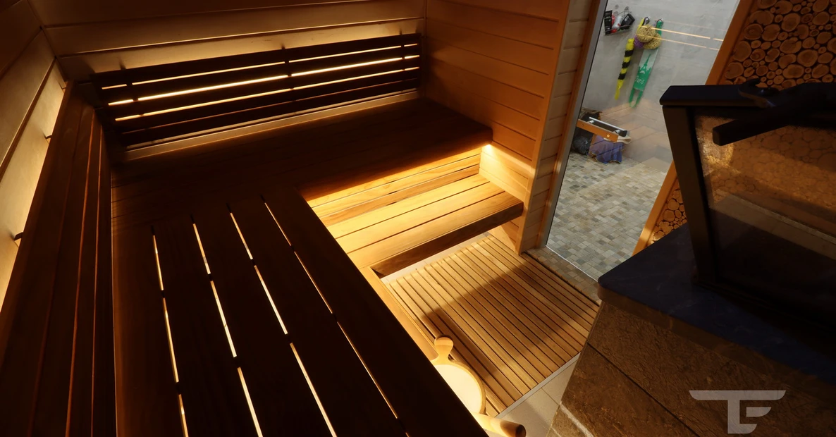 Отделка парной - это вагонка из ольхи, как классическое решение и практичное решение на долгие годы. А полок сделан из термодревесины из новозеландской сосны.