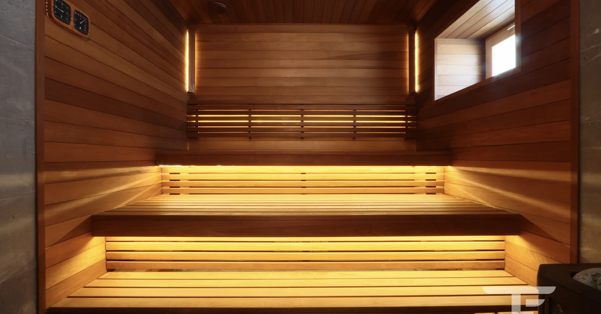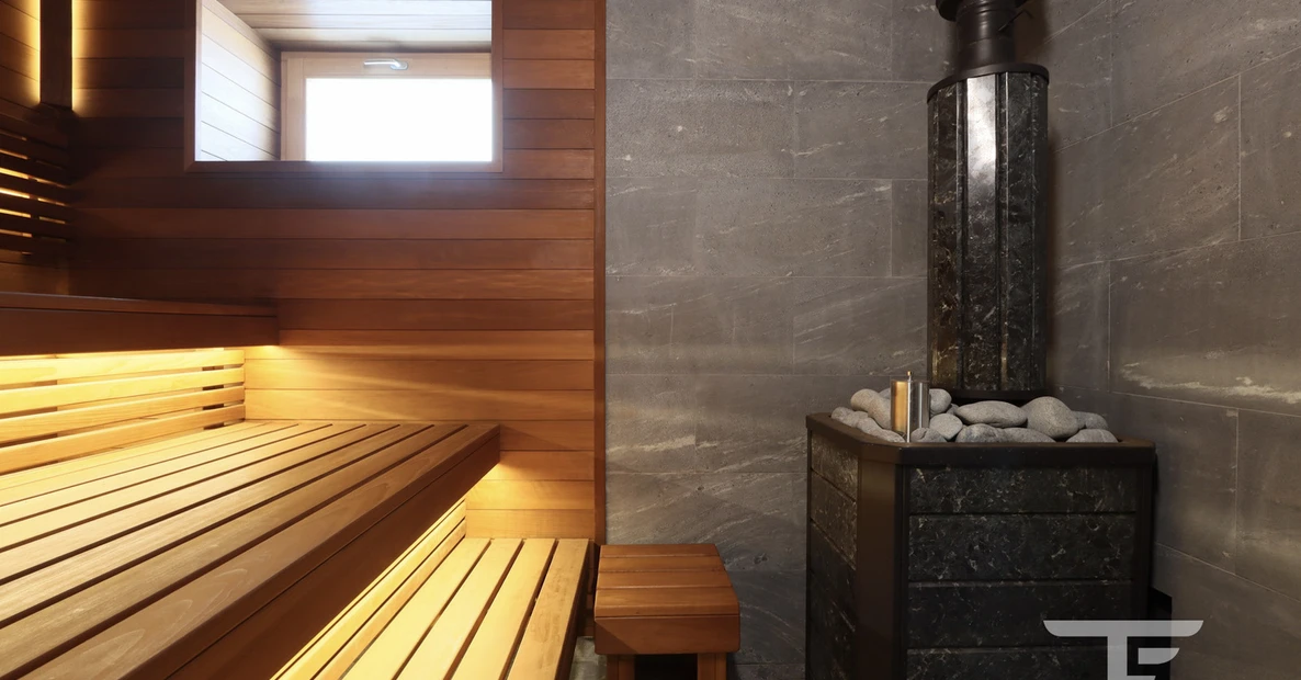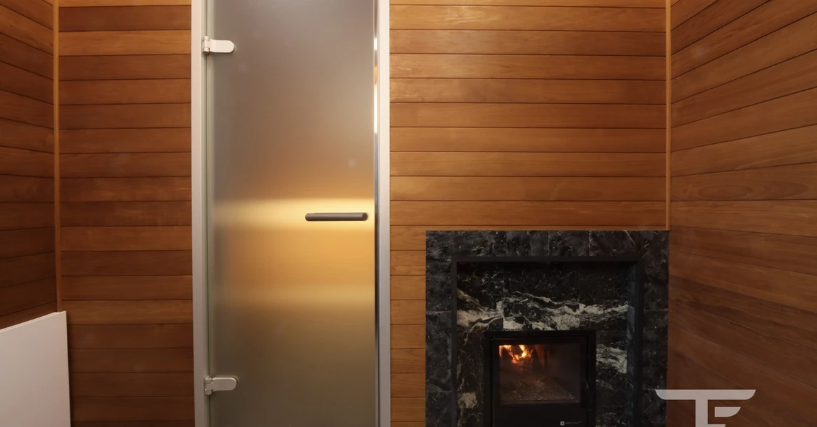 Термозащита и мокрая зона парной выделены плиткой из талькомагнезита.