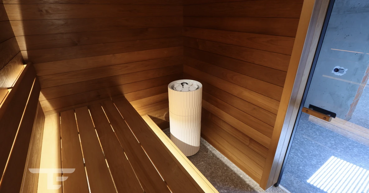 В отделке использована термоосина на стенах и в полке, а печь - это электрокаменка в цилиндрической облицовке из керамики.