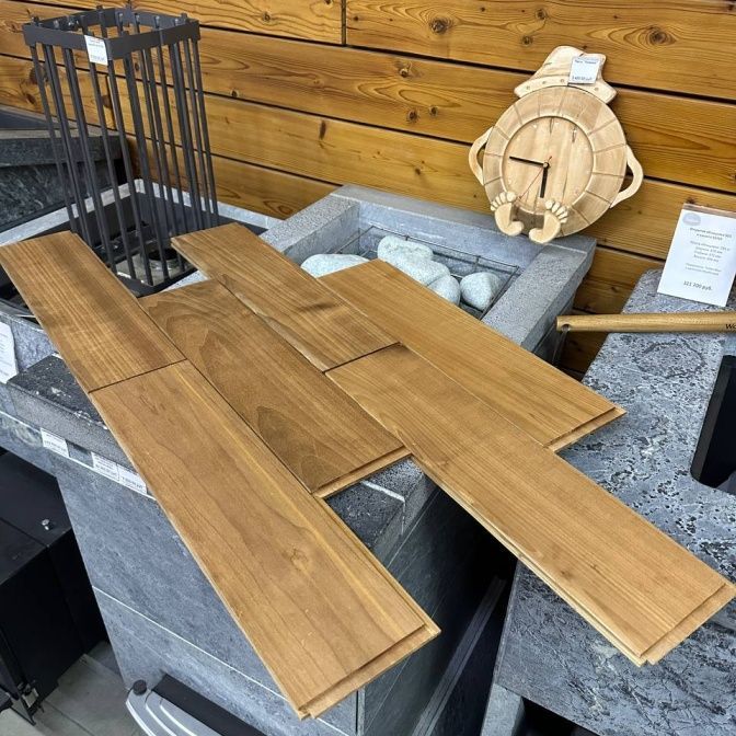 - Отделочные материалы — вагонка, полки из классических и экзотических пород дерева, от термососны до абаши.